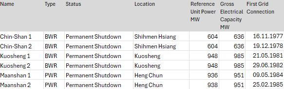 Taiwan: Nachdem am 18. Mai 2025 in Taiwan mit dem AKW Maanshan-2 das letzte Taiwanesische AKW abgeschaltet sind nun alle 6 ehemaligen AKW abgeschaltet.