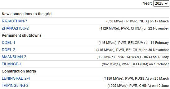 Ende letztes Jahr befanden sich 23 AKW in abgeschaltetem Zustand (davon 19 Reaktoren in Japan), Ende 2025 sind immer noch 23 AKW in abgeschaltetem Zustand. Japan kündete jedoch an im nächsten Jahr das AKW Kashiwazaki-Kariwa mit 7 Reaktoren wieder ans Netz bringen zu wollen.