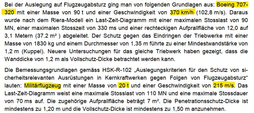 Die Auslegung des AKW Gösgen beruht auf veralteten Flugzeugtypen, neue Flugzeuge sind schwerer! Zudem muss heute von einem Terroranschalg ausgegangen werden, dabei würde ein Flugzeug nicht auf 370km/h abbremsen sondern sein Ziel sicherlich schneller anfliegen!